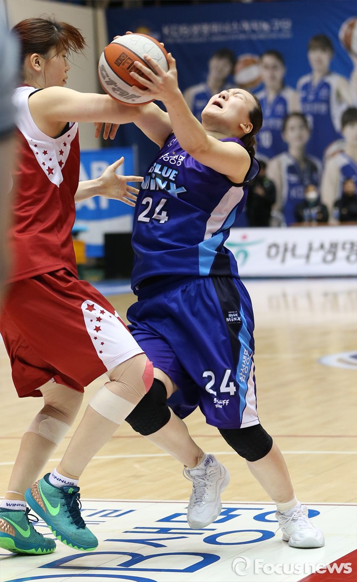 (구리=포커스뉴스) 24일 구리시체육관에서 열린 2015~2016 여자프로농구 KDB생명-삼성생명 경기에서 삼성생명 배혜윤이 드리블하다 KDB생명 김소담의 파울에 저지당하고 있다.