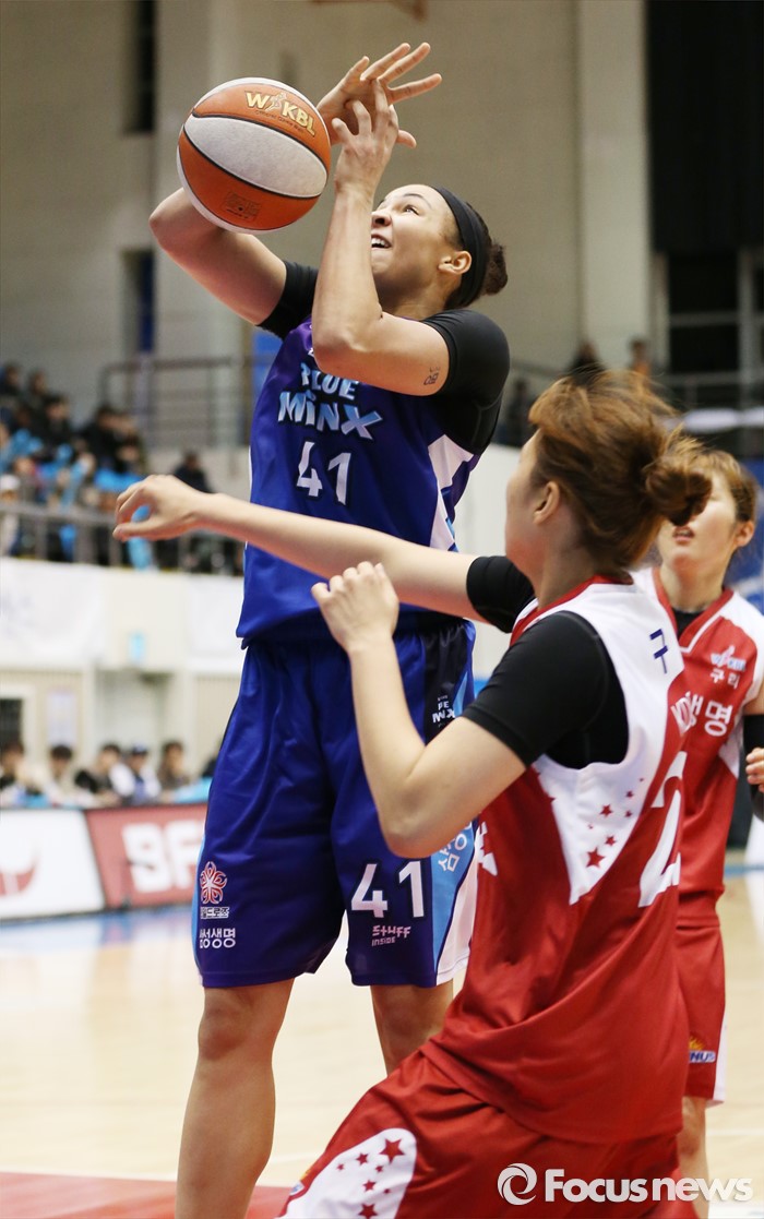 (구리=포커스뉴스) 24일 구리시체육관에서 열린 2015~2016 여자프로농구 KDB생명-삼성생명 경기에서 삼성생명 스톡스가 슈팅을 시도하다 KDB생명 구슬의 파울로 볼을 놓치고 있다.