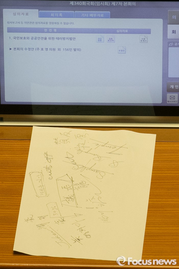 (서울=포커스뉴스) 테러방지법 저지를 위한 야당의 무제한 토론(필리버스터)이 진행중인 25일오전 서울 여의도 국회 본회의장에서 한 여당 의원석에 낙서한 종이가 놓여 있다.