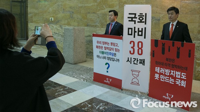 (서울=포커스뉴스) 테러방지법 직권상정에 반발해 야당의 무제한 토론(필리버스터)이 사흘째 진행되고 있는 25일 오전 서울 여의도 국회 본회의장 앞에서 김용남(왼쪽), 심윤조 새누리당 의원이 무제한 토론을 비판하는 시위를 하고 있다.