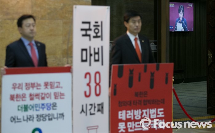 (서울=포커스뉴스) 테러방지법 직권상정에 반발해 야당의 무제한 토론(필리버스터)이 사흘째 진행되고 있는 25일 오전 서울 여의도 국회 본회의장 앞에서 김용남(왼쪽), 심윤조 새누리당 의원이 무제한 토론을 비판하는 시위를 하고 있다.