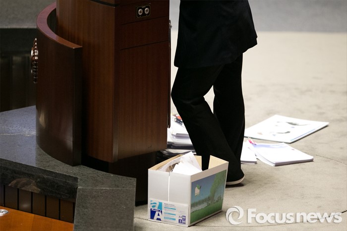 (서울=포커스뉴스) 최민희 더불어민주당 의원이 25일오전 서울 여의도 국회 본회의장에서 테러방지법 저지를 위한 무제한토론(필리버스터)을 하는 동안, 연설 자료들이 바닥에 놓여 있다.
