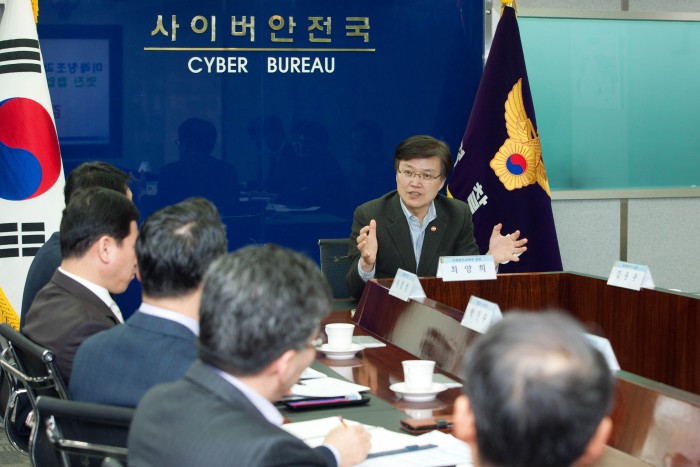 송정수 미래부 정보보호정책관은 "앞으로도 사이버공격 대비 모의훈련을 주기적으로 실시해 최근 발생한 청와대 사칭 해킹메일 유포 등 고도화되는 사이버 공격에 대한 대응 능력을 지속적으로 강화할 계획"이라며 "이용자들도 사이버공격으로 인한 피해 예방을 위해 PC나 스마트폰에 최신 백신을 설치·업데이트하고, 의심스러운 메일을 열람하지 않는 등 보안 관리에 유념해 주길 바란다"고 강조했다.최양희 미래창조과학부 장관이 21일 오전 서울 서대문구 경찰청을 방문해 사이버안전국 회의실에서 당부말을 하고 있다. <사진제공=미래부> 2016.02.21 지봉철 기자