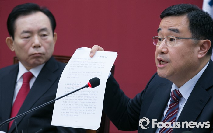 (서울=포커스뉴스) 김정훈(오른쪽) 새누리당 정책위의장이 25일 오전 서울 여의도 국회에서 열린 최고위원회의에 참석해 대한변호사협회의 테러방지법 관련 의견서를 들고 발언하고 있다.