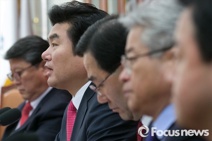 (서울=포커스뉴스) 원유철(왼쪽 두번째) 새누리당 원대대표가 25일 오전 서울 여의도 국회 집무실에서 테러방지법과 관련해, 특별 기자회견을 하고 있다.