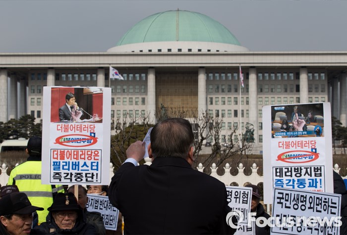 (서울=포커스뉴스) 25일 오전 서울 여의도 국회 앞에서 어버이연합을 비롯한 보수단체가 야당의 테러방지법 반대를 위한 무제한토론(필리버스터) 중단을 요구하며 기자회견을 하고 있다.