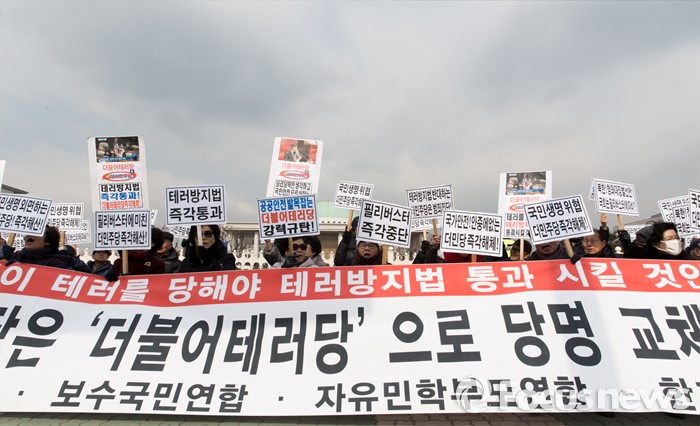 (서울=포커스뉴스) 25일 오전 서울 여의도 국회 앞에서 어버이연합을 비롯한 보수단체가 야당의 테러방지법 반대를 위한 무제한토론(필리버스터) 중단을 요구하며 기자회견을 하고 있다.