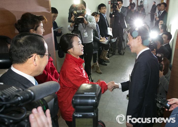 (서울=포커스뉴스) 25일 오전 서울 여의도 새누리당사에서 열린 20대 총선 공천 신청자 면접심사에 참석한 손수조(왼쪽) 부산 사상구 예비후보와 부산 사하을에 신청한 조경태 의원이 인사하고 있다.
