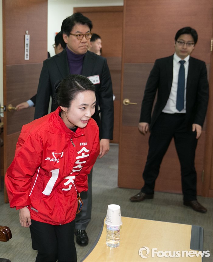 (서울=포커스뉴스) 25일 오전 서울 여의도 새누리당사에서 열린 20대 총선 공천 신청자 면접심사에 손수조(왼쪽), 장제원 부산 사상구 예비후보가 참석하고 있다.