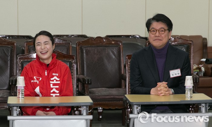 (서울=포커스뉴스) 25일 오전 서울 여의도 새누리당사에서 열린 20대 총선 공천 신청자 면접심사에 참석한 손수조(왼쪽), 장제원 부산 사상구 예비후보가 공관위원들의 질문에 답하고 있다.