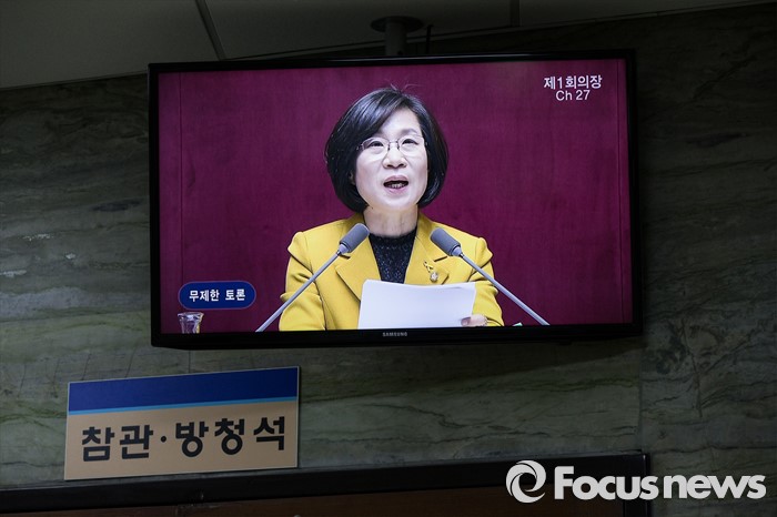 (서울=포커스뉴스) 김제남 정의당 의원이 25일 오전 서울 여의도 국회 본회의장에서 테러방지법 저지를 위한 무제한 토론(필리버스터)을 하고 있는 가운데 본회의장 밖 모니터에 김 의원의 발언 영상이 비춰지고 있다.