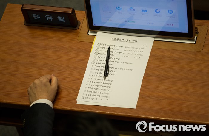(서울=포커스뉴스) 김제남 정의당 의원이 25일 오전 서울 여의도 국회 본회의장에서 테러방지법 저지를 위한 무제한 토론(필리버스터)을 하고 있는 가운데 원유철 새누리당 원내대표가 필리버스터 신청 현황지를 앞에 두고 자리에 앉아 있다.