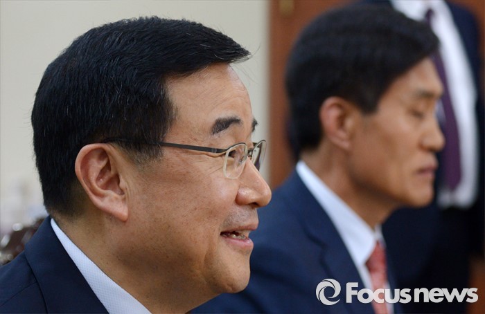(서울=포커스뉴스) 25일 오전 서울 여의도 새누리당사에서 20대 총선 공천 신청자 면접심사에 부산 남구갑에 신청한 김정훈(왼쪽) 정책위의장이 인사말을 하고 있다.