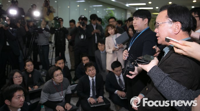 (서울=포커스뉴스) 김부겸 더불어민주당 대구 수성갑 예비후보가 25일 오후 서울 여의도 국회 정론관에서 컷오프에 반발해 탈당한 홍의락 의원에 대한 공천 배제 조치 취소를 요구하는 기자회견을 마친 뒤 취재진 질문에 답하고 있다. 홍 의원은 대구 북구을에 출마를 준비해왔다.
