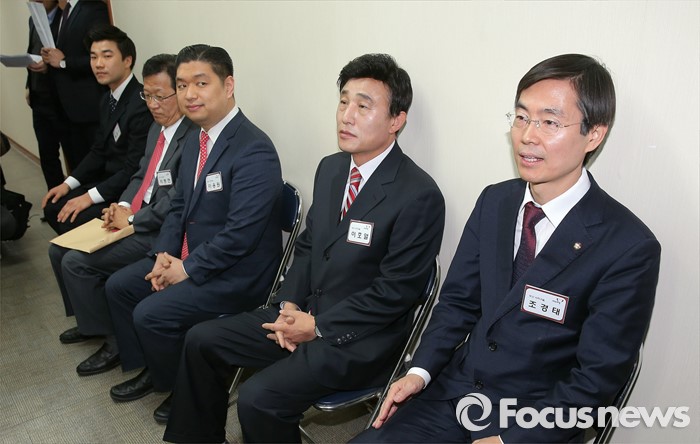 (서울=포커스뉴스) 25일 오전 서울 여의도 새누리당사에서 열린 20대 총선 공천 신청자 면접심사에 참석한 배관구(왼쪽부터), 석동현, 이용원, 이호열, 조경태 부산 사하을 예비후보가 면접을 기다리고 있다.
