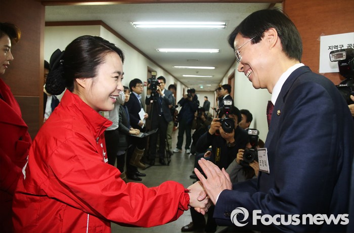 (서울=포커스뉴스) 25일 오전 서울 여의도 새누리당사에서 열린 20대 총선 공천 신청자 면접심사에 참석한 손수조(왼쪽) 부산 사상구 예비후보와 부산 사하을에 신청한 조경태 의원이 인사하고 있다.