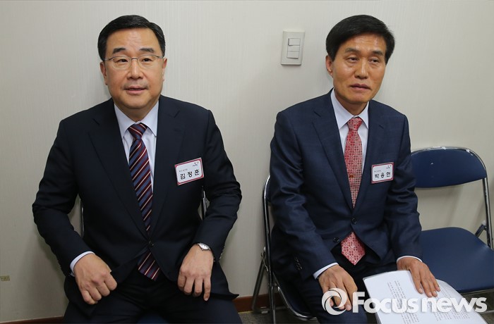 (서울=포커스뉴스) 25일 오전 서울 여의도 새누리당사에서 20대 총선 공천 신청자 면접심사에 참석한 박용현(오른쪽), 김정훈 부산 남구갑 예비후보가 심사를 기다리고 있다. 김 후보는 당 정책위의장을 맡고 있다.