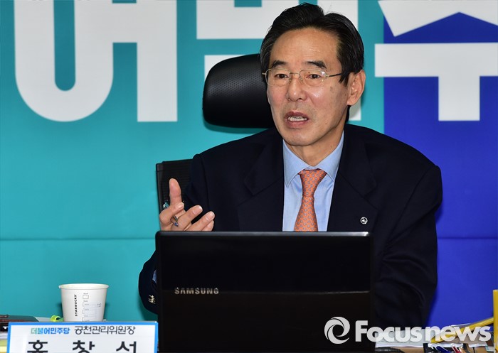 (서울=포커스뉴스) 25일 오전 서울 여의도 더불어민주당사에서 열린 20대 총선 공천 신청자 면접심사에 참석한 홍창선 공천관리위원장이 박영순, 고재일, 정현태 대전 대덕 예비후보에게 질의하고 있다.