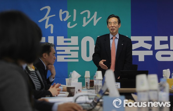 (서울=포커스뉴스) 25일 오전 서울 여의도 더불어민주당사에서 열린 20대 총선 공천 신청자 면접심사에 참석한 홍창선 공천관리위원장 등 위원들이 박영순, 고재일, 정현태 대전 대덕 예비후보에 대한 심사를 하고 있다.