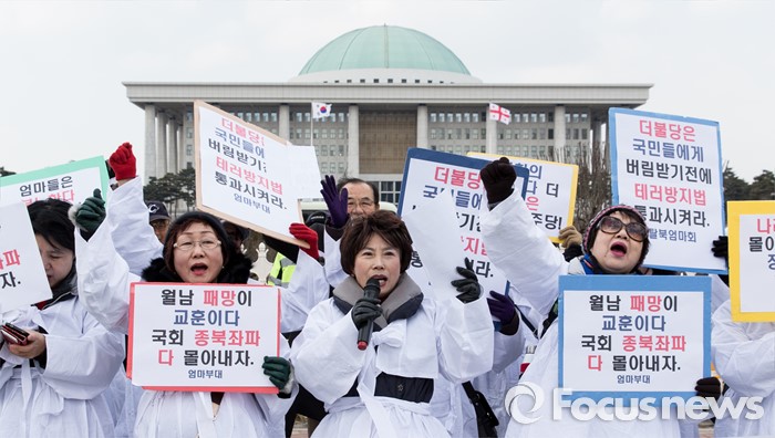 (서울=포커스뉴스) 25일 오후 서울 여의도 국회의사당 앞에서 엄마부대가 봉사단 회원들이 테러방지법을 반대하는 더불어민주당을 규탄하며 구호를 외치고 있다.