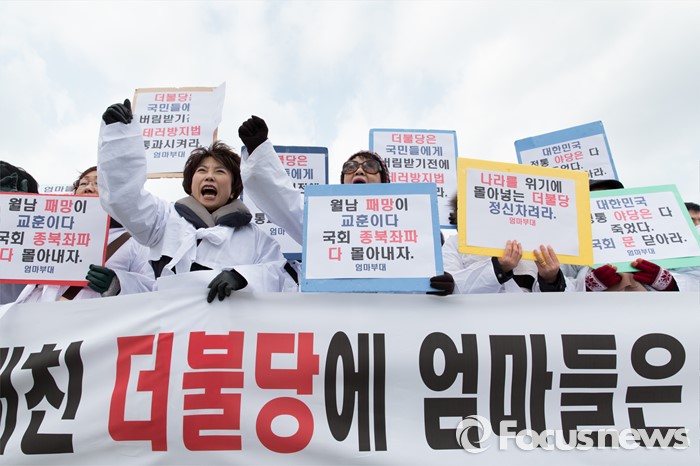 (서울=포커스뉴스) 25일 오후 서울 여의도 국회의사당 앞에서 엄마부대가 봉사단 회원들이 테러방지법을 반대하는 더불어민주당을 규탄하며 구호를 외치고 있다.
