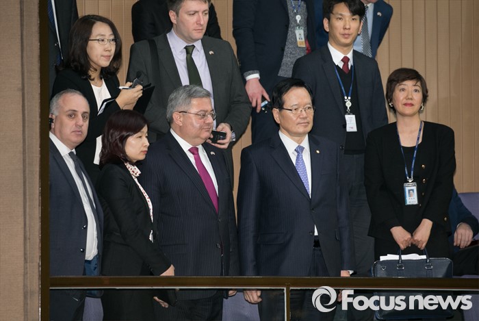 (서울=포커스뉴스) 테러방지법 직권상정에 반발해 야당의 무제한 토론(필리버스터)이 사흘째 진행되고 있는 25일 오후 서울 여의도 국회 본회의장에서 정의화 국회의장이 국회를 방문한 다비드 우수파쉬빌리(David USUPASHVILI) 조지아 국회의장에게 현 상황과 관련 설명하고 있다.