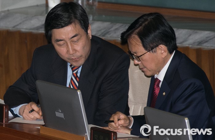 (서울=포커스뉴스) 테러방지법 직권상정에 반발해 야당의 무제한 토론(필리버스터)이 사흘째 진행되고 있는 25일 오후 서울 여의도 국회 본회의장에서 이종걸(왼쪽) 더불어민주당 원내대표와 김기준 원내대변인이 대화하고 있다.