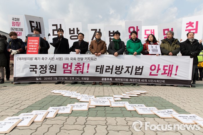 (서울=포커스뉴스) 25일 오후 서울 여의도 국회의사당 앞에서 테러방지법 제정을 반대하는 시민사회단체들이 테러방지법 폐기 촉구 30만 시민서명 국회전달 기자회견을 하고 있다.