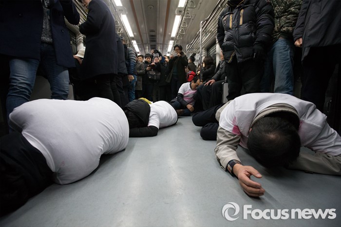 (서울=포커스뉴스) 25일 오후 서울 마포구 월드컵경기장역에서 실시한 지하철 대형사고 대응 불시 현장훈련에서 승객역을 맡은 시민들이 쓰러져 있다.