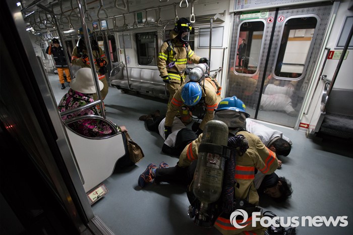 (서울=포커스뉴스) 25일 오후 서울 마포구 월드컵경기장역에서 실시한 지하철 대형사고 대응 불시 현장훈련에서 소방관들이 구조활동을 하고 있다.