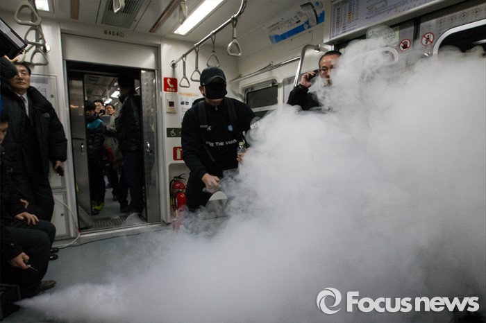 (서울=포커스뉴스) 25일 오후 서울 마포구 월드컵경기장역에서 실시한 지하철 대형사고 대응 불시 현장훈련에서 방화범역을 받은 시민이 불을 지르고 있다.