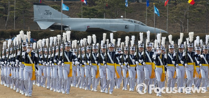 (청주=포커스뉴스) 25일 오후 충북 청주시 공군사관학교 연병장에서 열린 제64기 공군사관학교 졸업식에서 후배생도들이 분열하고 있다.