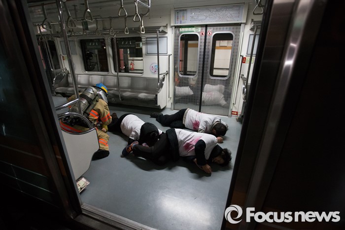 (서울=포커스뉴스) 25일 오후 서울 마포구 월드컵경기장역에서 실시한 지하철 대형사고 대응 불시 현장훈련에서 소방관들이 쓰러진 승객역을 맡은 시민들을 구조하고 있다.