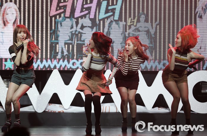 (서울=포커스뉴스) 25일 오후 서울 마포구 예스24 무브홀에서 열린 걸그룹 마마무의 정규 1집 'Melting' 쇼케이스에 참석한 멤버들이 신곡무대를 선보이고 있다. 왼쪽부터 멤버 문별, 솔라, 휘인, 화사