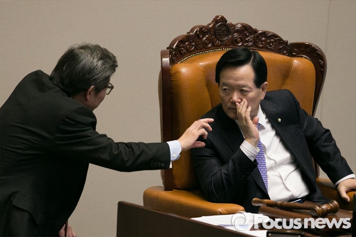 여야 양측의 중재 의향에 대해서는 "중재안은 내지 않았고, 국회 법제예산실에서 몇 가지 아이디어를 (양당에) 전달했다"면서 "국민의당도 아이디어(정보위 전임상임위화)를 냈고, 그런 걸 갖고 양당 교섭단체 대표들이 논의하고 있다"고 밝혔다.정의화(오른쪽) 의장과 박형준 사무총장이 25일 오전 서울 여의도 국회 본회의장에서 논의하고 있다. 2016.02.25 박철중 기자