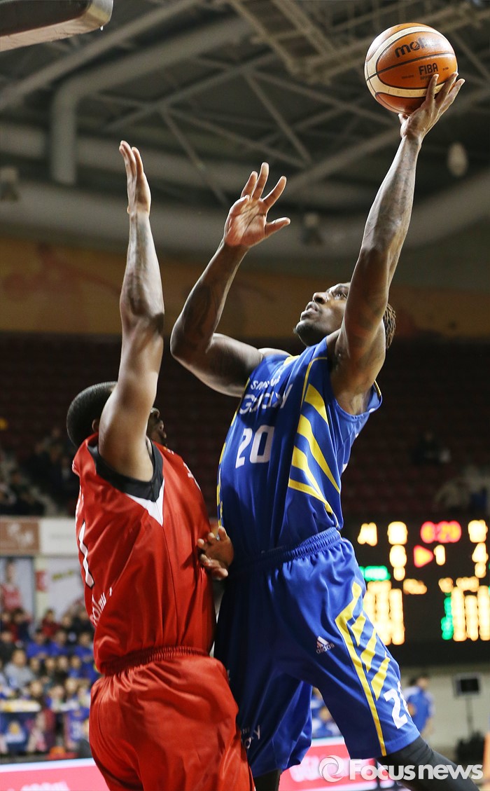 (안양=포커스뉴스) 25일 안양실내체육관에서 열린 2015-2016 프로농구 6강 플레이오프 KGC-삼성 1차전에서 삼성 라틀리프가 KGC 찰스 로드의 마크 위로 점프슛을 시도하고 있다.