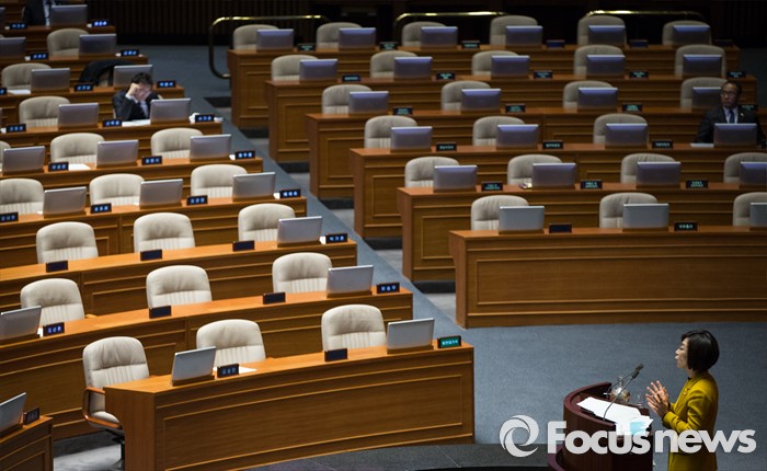 (서울=포커스뉴스) 김제남 정의당 의원이 25일 오전 서울 여의도 국회 본회의장에서 테러방지법 저지를 위한 무제한 토론(필리버스터)을 하고 있는 가운데 빈 의석들이 보이고 있다.