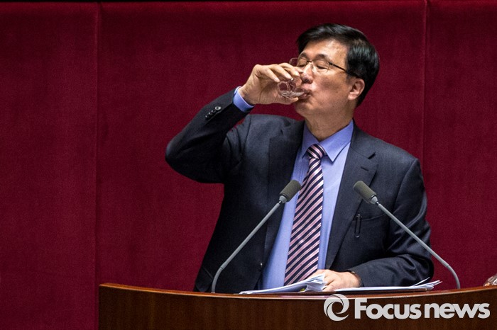 (서울=포커스뉴스) 테러방지법 직권상정에 반발해 야당의 무제한 토론(필리버스터)이 사흘째 진행되고 있는 25일 오후 서울 영등포구 국회 본회의장에서 신경민 더불어민주당 의원이 물을 마시고 있다.