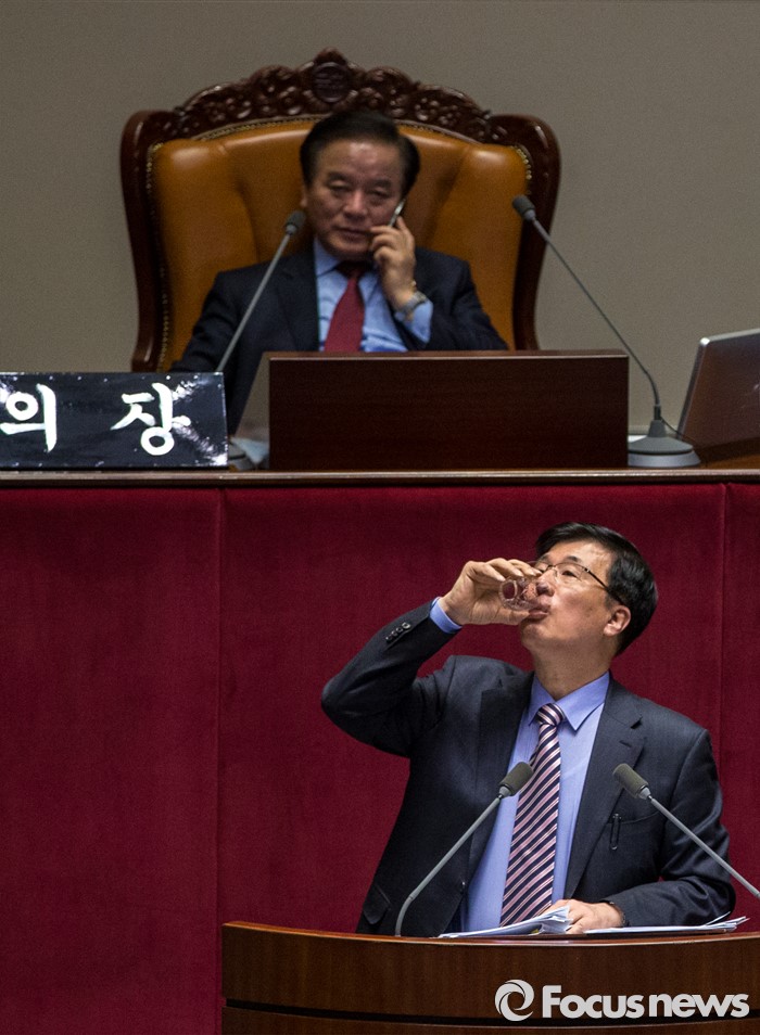 (서울=포커스뉴스) 테러방지법 직권상정에 반발해 야당의 무제한 토론(필리버스터)이 사흘째 진행되고 있는 25일 오후 서울 영등포구 국회 본회의장에서 신경민 더불어민주당 의원이 물을 마시고 있다.