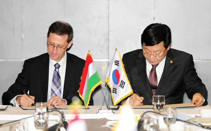 (서울=포커스뉴스) 주형환 산업통상자원부 장관(수석대표)이 25일 오후 서울 중구 소공동 롯데호텔 아스토룸에서 버르거 미하이(Varga Mihaly) 헝가리 국가경제부 장관(수석대표)과 '제2차 한-헝가리 경제공동위원회'를 갖고, 한-헝가리 양국간 무역․투자 및 중소기업 협력 확대 방안과 방위산업 및 인프라 분야 협력 확대 방안 등에 관해 의견을 교환한 후 폐회식에서 MOU 체결 및 서명식을 갖고 있다. <사진제공=산업통상자원부>