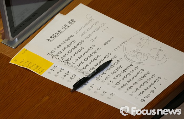 (서울=포커스뉴스) 테러방지법 직권상정에 반발해 야당의 무제한 토론(필리버스터)이 나흘째 진행되고 있는 26일 오전 서울 여의도 국회 본회의장에서 원유철 새누리당 원내대표의 자리에 토론 신천 현황 명단이 보이고 있다.
