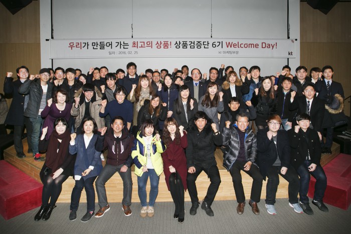 KT 마케팅부문장 강국현 전무는 "KT는 고객인식 1등 상품 및 고객불만(VOC) 제로화 실현을 목표로, 최고의 품질과 차별화된 혁신적 서비스를 제공해 글로벌 1등 기업으로 거듭나고자 한다"며 "고객과 현장직원으로 구성된 상품검증단의 개선의견과 아이디어를 실제상품개발에 적극 반영하겠다"고 밝혔다.KT 마케팅부문장 강국현 전무가 2016년 상품검증단 6기 출범식을 마치고 기념 촬영을 하고 있다. <사진제공=KT>