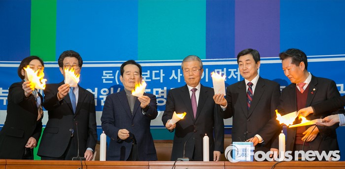 (서울=포커스뉴스) 김종인 더불어민주당 비대위 대표, 이종걸 원내대표, 이목희 정책위의장 등 참석 의원들이 26일 오전 서울 여의도 국회에서 비대위-선대위 연석회의에 앞서 부실부채 탕감 퍼포먼스를 하고 있다.