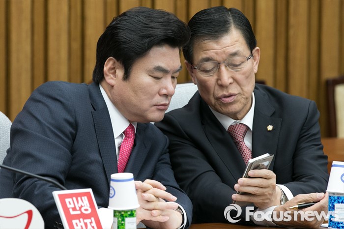 (서울=포커스뉴스) 원유철(왼쪽) 새누리당 원내대표와 황진하 사무총장이 26일 오전 서울 여의도 국회에서 열린 원내대책회의에 참석해 대화하고 있다.