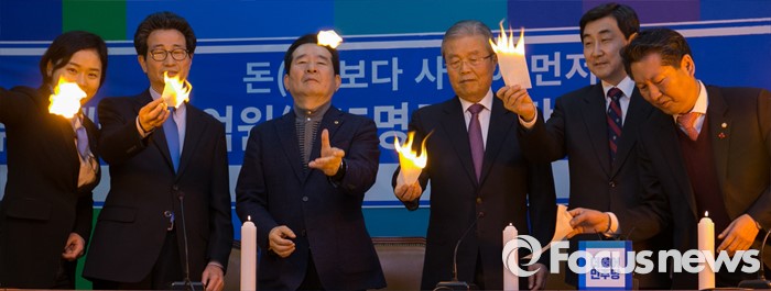 (서울=포커스뉴스) 김종인 더불어민주당 비대위 대표, 이종걸 원내대표, 이목희 정책위의장 등 참석 의원들이 26일 오전 서울 여의도 국회에서 비대위-선대위 연석회의에 앞서 부실부채 탕감 퍼포먼스를 하고 있다.