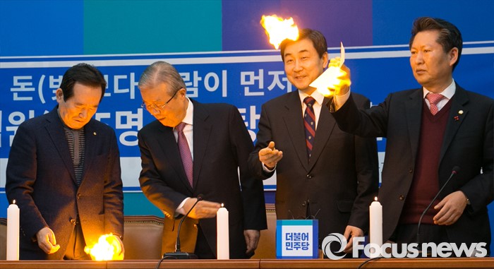 (서울=포커스뉴스) 김종인 더불어민주당 비대위 대표, 이종걸 원내대표 등 의원들이 26일 오전 서울 여의도 국회에서 비대위-선대위 연석회의에 앞서 부실부채 탕감 퍼포먼스를 하고 있다. 왼쪽부터 정세균 의원, 김 대표, 이 원내대표, 정청래 의원.
