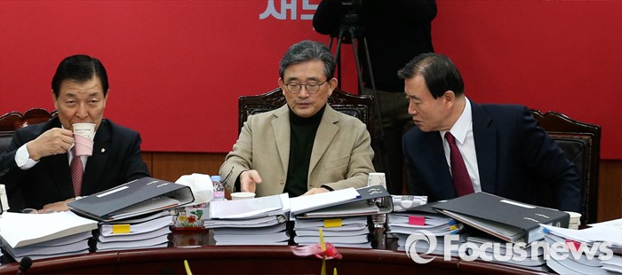 (서울=포커스뉴스) 26일 오전 서울 여의도 새누리당사에서 열린 20대 총선 공천 신청자 면접심사에 참석한 이한구(가운데) 공천관리위원장과 홍문표(오른쪽) 위원이 대화하고 있다. 왼쪽은 황진하 부위원장.
