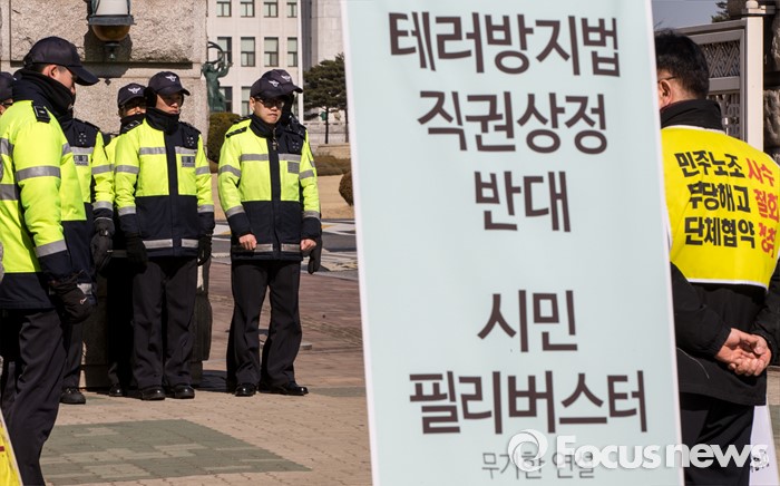 (서울=포커스뉴스) 26일 오전 서울 여의도 국회 정문 앞에서 테러방지법 직권상정 반대 시민 필리버스터가 이어지고 있다.