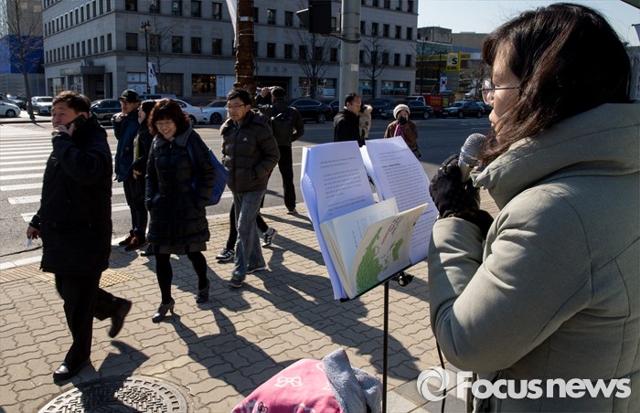(서울=포커스뉴스) 26일 오전 서울 여의도 국회 정문 앞에서 김지미 민변 변호사가 테러방지법 직권상정 반대 시민 필리버스터를 이어가고 있다.