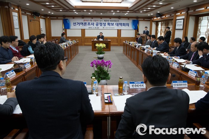 (과천=포커스뉴스) 김신기 선거정책실장이 26일 오후 경기도 과천시 중앙선거관리위원회에서 열린 선거여론조사 공정성 확보 대책회의에서 정당관계자, 주요 여론조사업체 대표자들에게 모두발언을 하고 있다.